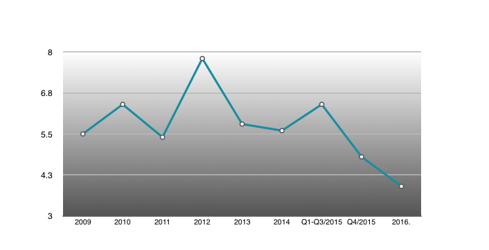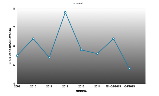 Postignuto je smanjenje prosječnog vremena trajanja umjeravanja, za promatrane skupine instrumenata uključujući instrumente za koje se koristi vanjska usluga umjeravanja i uračunavajući vrijeme koje isti provedu u transportu, sa 6,4 na 4,8 dana što je bilo najniže trajanje umjeravanja od početka poslovanja. Cilj projekta bio je postići 20%-tno povećanje brzine umjeravanja. Ostvareno je 25%-tno povećanje brzine umjeravanja odnosno smanjenje broja dana umjeravanja dok je u isto vrijeme preokrenut trend što je također bio cilj projekta. Rezultat je to mjerenja u zadnjem kvartalu 2015. godine. Međutim, kako se pokazalo, sinergijski učinak svih poboljšanja mogli smo izmjeriti tek u 2016. godini. Na Slici 2. možemo vidjeti da se vrijeme trajanja umjeravanja nastavilo smanjivati jer je bilo potrebno određeno vrijeme da implemetirana poboljšanja pokažu svoje rezultate. Tako je prosječno trajanje umjeravanja u 2016. godini iznosilo 3,9 dana (zajedno s vikedima, blagdanima, outsourcingom i transportom) što odgovara poboljšanju od 40%, odnosno zadani cilj je dvostruko premašen.